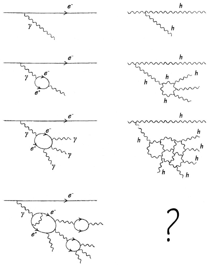 Слева: электрон (e?) испускает виртуальные частицы: фотоны (?), позитроны (e+) и другие электроны. Каскад частиц нарастает сравнительно медленно для того, чтобы мы сумели отследить процесс математически, используя перенормировку. Справа: гравитон (h) испускает такое множество виртуальных гравитонов, что никакая перенормировка не в состоянии описать весь процесс