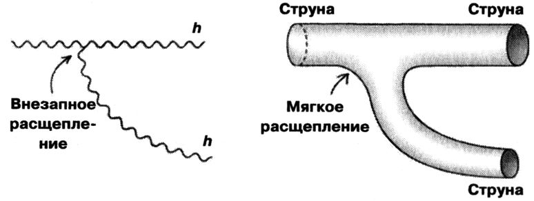 В месте ветвления нет точки, в которой происходит излом, Y-образная фигура, иллюстрирующая этот процесс, выглядит гладким непрерывным отрезком трубы, только необычной формы. Всё это приводит к тому, что деление струны оказывается более «нежным» процессом, нежели деление частицы. Физики говорят, что струны взаимодействуют по своей природе «мягко», в то время как частицы взаимодействуют по своей природе «жёстко». Именно эта мягкость и обеспечивает лучшее поведение теории струн, чем общей теории относительности, в отношении применимости квантово-механического описания.