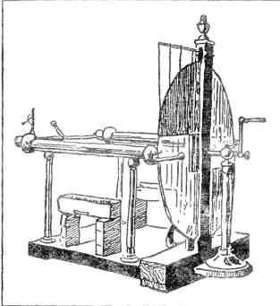 Кавендиша всех этих машин еще не было. Ученые знали только один способ добывать электрическую искру: трение. Кавендиш получал электрические искры трением стекла о кожу. В машине, которая была у него в лаборатории, большое стеклянное колесо, вращаясь, терлось о кожаные подушки (рис. 6). Стекло и кожа заряжались электричеством, и это электричество Кавендиш отводил по проволокам в рюмки со ртутью — электричество стекла в одну рюмку, электричества кожи в другую. Когда электричества в рюмках скапливалось достаточно, электрические искры начинали скакать из одной рюмки в другую по изогнутой трубке, наполненной смесью азота с кислородом.