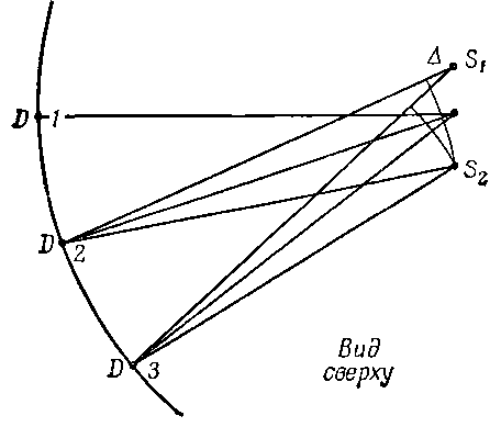 Здесь появляется интересная возможность. Пусть заряды в S1 и S2 ускоряются вверх и вниз, но в S2 движение зарядов запаздывает и сдвинуто по фазе на 180°. Тогда в один и тот же момент времени поле, создаваемое S1, будет иметь одно направление, а поле, создаваемое S2,— противоположное, и, следовательно, в точке 1 никакого эффекта не возникнет. Относительную фазу колебаний легко создать с помощью трубки, передающей сигнал в S2. При изменении длины трубки меняется и время прохождения сигнала до S2, а следовательно, меняется разность фаз колебаний. Подобрав нужную длину трубки, мы можем добиться такого положения, что сигнал исчезнет, несмотря на движение зарядов в источниках S1 и S2! Излучение каждого источника в отдельности легко установить, выключая один из них; тогда действие второго обнаруживается сразу. Таким образом, если все сделать аккуратно, оба источника в совокупности могут дать нулевой эффект.