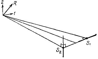Теперь интересно убедиться, что сложение двух полей фактически есть векторное сложение. Мы только что рассмотрели случай движения зарядов вверх и вниз; обратимся теперь к примеру двух непараллельных движений. Прежде всего установим для S1 и S2 одинаковые фазы, т. е. пусть заряды движутся одинаково. Далее повернем S1 на угол 90°, как показано на фиг. 28.4.