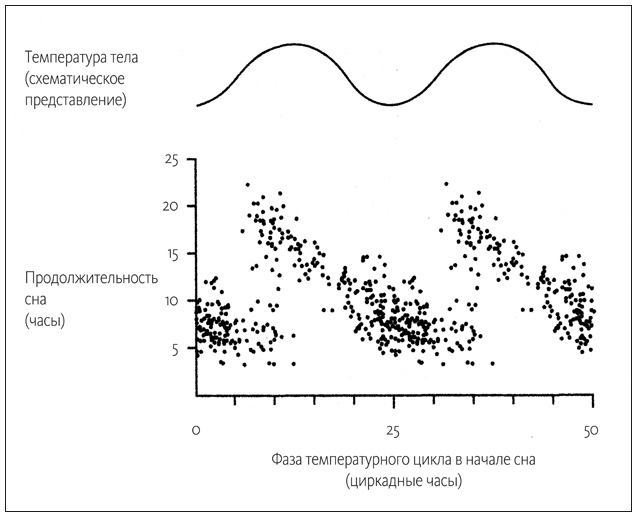 Каждый раз, когда участники эксперимента укладывались спать вблизи пика своего температурного цикла, последующий эпизод сна всегда оказывался очень продолжительным, составляя в среднем 15 часов. И наоборот, когда они укладывались спать вблизи времени минимальной температуры, они спали гораздо меньше – в среднем около 8 часов. «Облако» продолжительностей сна, рассматриваемое по всем фазам, было похоже на волну в форме зубца пилы[71].