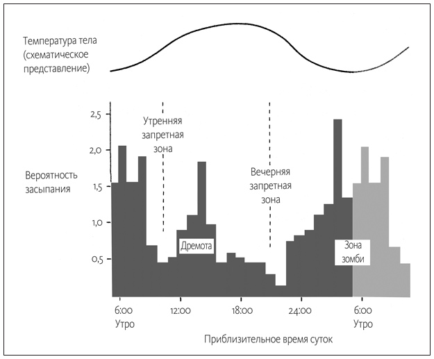 Вероятность того, что человек уснет в одном из этих двух промежутков времени («запретных зон», по определению Кронауера), была очень мала (хотя и не исключалась полностью). Соответствующие моменты, выраженные во времени суток, можно было оценить, применив упоминавшуюся ранее формулу преобразования: температурный минимум наступает приблизительно за 1–2 часа до привычного времени пробуждения. Таким образом, для того, кто привык спать с 23:00 до 7:00, эти данные прогнозировали «утреннюю запретную зону» примерно с 10 до 11 утра, а «вечернюю запретную зону» – примерно с 21:00 до 22:00, то есть за один-два часа до укладывания в постель.