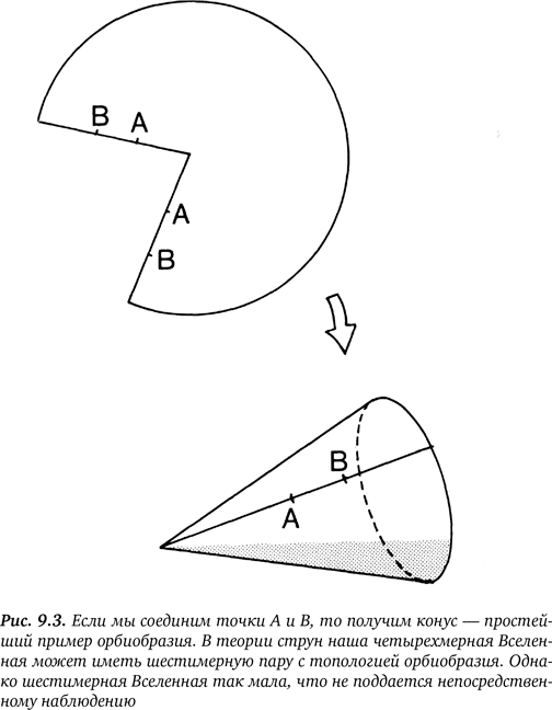Представить себе орбиобразие поможет перемещение на 360? по кругу. Ясно, что в результате такого движения мы вернёмся в исходную точку. Другими словами, если мы протанцуем круг 360? в хороводе, то вернёмся к тому же месту, с которого начали. Но если в орбиобразии мы проделаем путь менее 360?, то всё равно вернёмся в исходную точку. Это утверждение может показаться абсурдным, тем не менее сконструировать орбиобразие легко. Представьте себе флатландцев, живущих на конусе. Если они проделают путь менее 360? вокруг вершины конуса, то прибудут в исходную точку. Таким образом, орбиобразие — многомерное обобщение конуса (рис. 9.3).