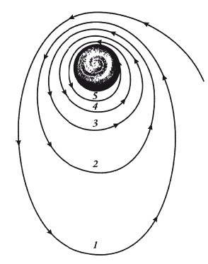 Рис. 33. Спиральный путь ракетного корабля, тормозящегося о земную атмосферу при возвращении из межпланетного полета