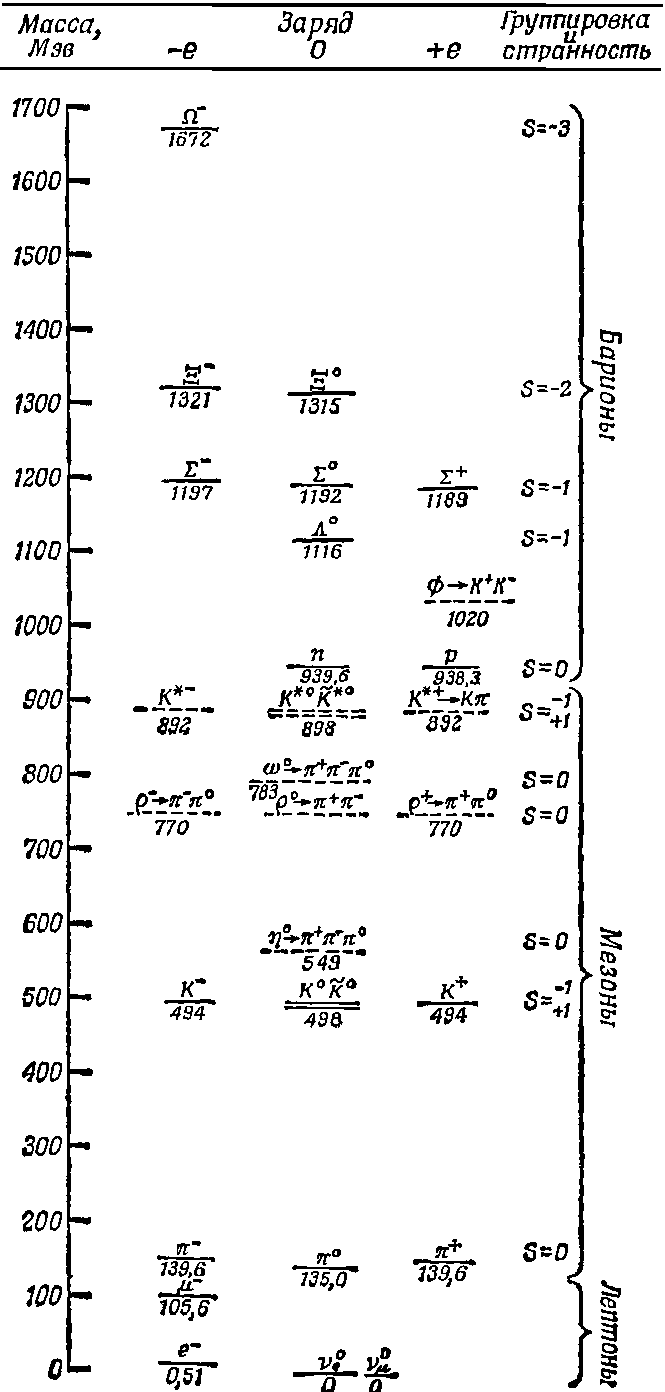 Частицы подчеркнуты сплошной линией, «резонансы» — штрихами. Некоторых частиц в таблице нет совсем: нет фотона и гравитона, очень важных частиц с нулевыми массой и зарядом (они не попадают в барион-мезон-лептонную схему классификации), нет и кое-каких новейших резонансов (?, f, Y*' и др.). Античастицы мезонов в таблице приводятся, а для античастиц лептонов и барионов надо было бы составить новую таблицу, сходную с этой, но только зеркально отраженную относительно нулевой колонки. Хотя все частицы, кроме электрона, нейтрино, фотона, гравитона и протона, неустойчивы, продукты их распада написаны только для резонансов. Странность лептонов тоже не написана, так как это понятие к ним неприменимо — они не взаимодействуют сильно с ядрами.