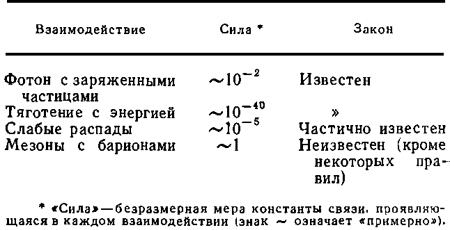 Итак, мы встретились с целым строем частиц, которые все вместе, по-видимому, являются очень фундаментальной частью вещества. К счастью, эти частицы не все отличаются по своему взаимодействию друг от друга. Видимо, есть только четыре типа взаимодействий между ними. Перечислим их в порядке убывающей силы: ядерные силы, электрические взаимодействия, ?-распадное взаимодействие и тяготение. Фотон взаимодействует со всеми заряженными частицами с силой, характеризуемой некоторым постоянным числом 1/137. Детальный закон этой связи известен — это квантовая электродинамика. Тяготение взаимодействует со всякой энергией, но чрезвычайно слабо, куда слабее, чем электричество. И этот закон известен. Потом идут так называемые слабые распады: ?-распад, из-за которого нейтрон распадается довольно медленно на протон, электрон и нейтрино. Тут закон выяснен лишь частично. А так называемое сильное взаимодействие (связь мезона с барионом) обладает по этой шкале силой, равной единице, а закон его совершенно темен, хоть и известны кое-какие правила, вроде того, что количество барионов ни в одной реакции не меняется.