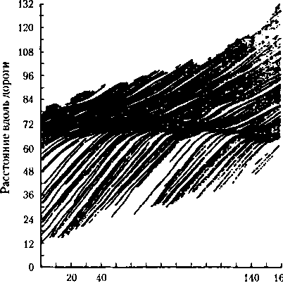 Рис. 7.6. Автомашины, «выпавшие» из режима свободного потока, иногда начинают двигаться по весьма запутанным траекториям, свидетельствующим о наличии других, хаотических и непредсказуемых режимов движения.
