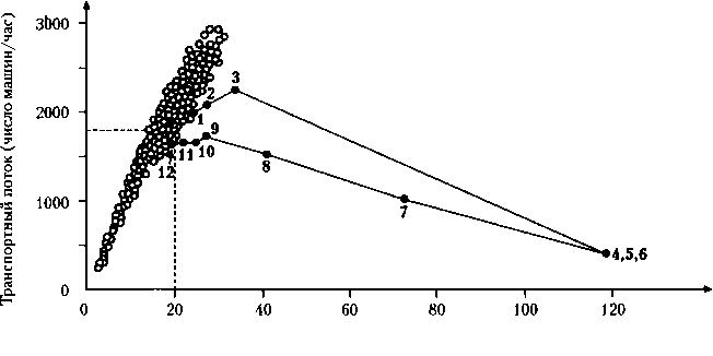Естественно, у читателя возникнет вопрос, каким образом полученные статистические данные могут быть связаны с поведением отдельного водителя или использованы им на практике? На рис. 7.5 представлена сер* последовательно пронумерованных точек, каждая из которых соответствует измерениям параметров потока машин по шоссе в определенной точке с интервалом 3 минуты. В момент, соответствующий точке 1, движение предстаі ляет собой свободный поток с плотностью чуть выше критического значени составляющего около 20 машин на километр. Затем движение начина* несколько замедляться, оставаясь при этом на метастабильной ветви (точь 2 и 3), после чего неожиданно возникают пробки, практически останавлі вающие поток (точки 4, 5 и 6). Примерно через 10 минут движение вноі восстанавливается в режиме свободного потока. Примечательно, что точк характеризующие это движение, группируются возле критической точки (точка 12). Другими словами, движение после пробки восстанавливаете постепенно и лишь при значениях плотности ниже критической, что ясно указывает на наличие некоторого гистерезисного эффекта. История вновь оказывается необратимой — мы не можем повторить маршрут перехода ( точки 1 к точке 12 в обратном порядке.