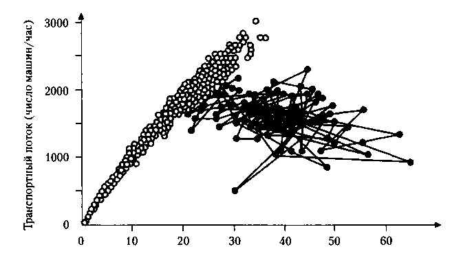 Все это, казалось бы, говорит в пользу модели НаШ, но поведение тран портных потоков в действительности таит в себе еще много сюрпризо На рис. 7.6 представлен другой набор данных наблюдений, отражающя новые аспекты движения. Общая картина практически не изменилас присутствует ветвь свободного потока с метастабильной областью и веті тесного потока, отходящая от первой. Однако ветвь тесного потока вдр] превращается в запутанный клубок! Машины не просто «втыкаются в пробку, замедляясь почти до полной остановки и затем, после преодоления пробки, вновь ускоряясь. На самом деле при переходе от свободного потока к тесному скорости отдельных машин (и соответственно величина потока) могут изменяться в очень широких пределах.