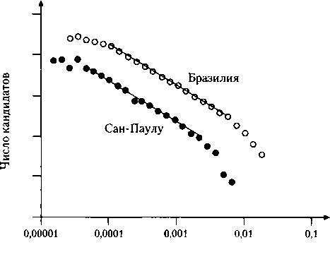 Рис 13.1. Статистика голосования на выборах 1998 года в Бразилии. Число кандидатов, получивших определенную долю голосов избирателей, описывается степенным распределением. Черные точки на рисунке относятся к результатам голосования в штате Сан-Паулу, а белые — к стране в целом. Обе прямые имеют практически одинаковый наклон.