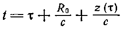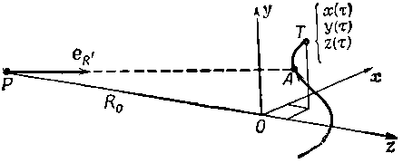 Конечно, нужно всегда помнить, что координаты берутся не в момент наблюдения, а с учетом запаздывания. В данном случае запаздывание зависит и от z(?). Чему равно время запаздывания? Обозначим время наблюдения через t (это время в точке наблюдения Р), тогда время ?, которое в точке А соответствует времени t, не будет совпадать с t, а отстает от него на промежуток времени, необходимый свету, чтобы пройти все расстояние от заряда до точки наблюдения. В первом приближении время запаздывания равно R0/c, т. е. постоянной (что неинтересно), а в следующем приближении должно зависеть от z-координаты положения заряда в момент ?, потому что для заряда q, сдвинутого немного назад, запаздывание увеличивается. Этим эффектом мы раньше пренебрегали, если теперь учесть его, то мы получим формулу, пригодную для любых скоростей.