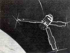 Рис. 10.1. Рентгеновский спутник «Ухуру» в космосе (рисунок). Четыре солнечные панели вырабатывают электричество для питания аппаратуры. Спутник совершает один оборот вокруг своей оси за десять минут, и рентгеновский приемник просматривает небо «полосами». Результаты передаются по каналам связи на Землю.