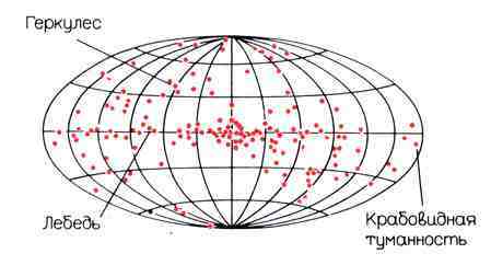 Первый вопрос, который интересует астрономов в связи со вновь открытыми объектами, это далеко или близко они находятся. В большинстве случаев определить расстояние до небесного тела чрезвычайно трудно, но нередко достаточно сделать хотя бы приблизительные оценки. Можно было бы узнать, например, принадлежат ли эти объекты к нашему Млечному Пути или нет. Мы уже видели, как это делается, на примере пульсаров. Для этого нужно выяснить, распределены ли эти объекты на небе таким же образом, как и звезды нашей Галактики. Результаты подобной проверки иллюстрирует рис. 10.2. Здесь объекты, обнаруженные спутником «Ухуру», нанесены на градусную сетку, горизонтальная ось которой соответствует плоскости симметрии Млечного Пути. С первого взгляда ясно, что большинство рентгеновских источников располагается вблизи Млечного Пути. Там, где много звезд, оказывается много и рентгеновских источников. Если же смотреть в сторону от Млечного Пути, то рентгеновских источников немного, и они оказываются прежде всего там, где находятся удаленные галактики.