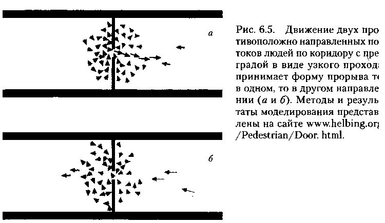 Когда две группы пиплоидов пытаются одновременно пройти в противоположных направлениях через один проход, естественно, возникает «прорыв» то в одном, то в другом направлении (рис. 6.5). Одна из групп «захватывает» дверь на некоторое время (какие-то нахалы в ярких куртках прорываются первыми, а за ними следуют остальные), а вторая ждет, пока этот поток не ослабеет. Разумеется, вежливость тут ни при чем, поскольку пиплоиды второй группы просто стараются избежать слишком тесного сближения с членами первой.