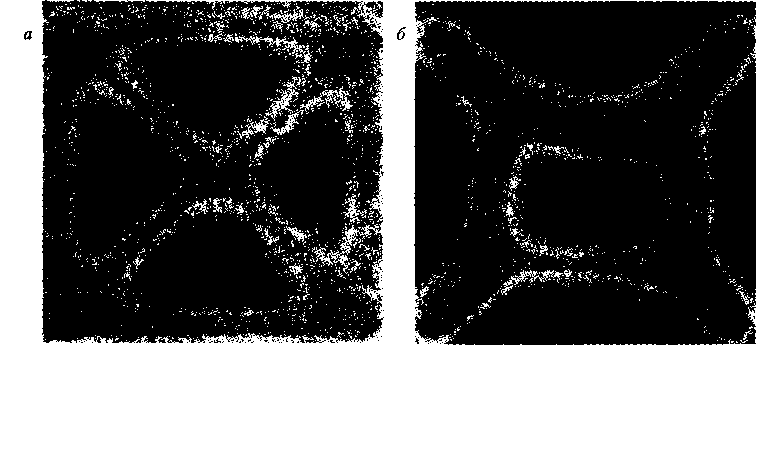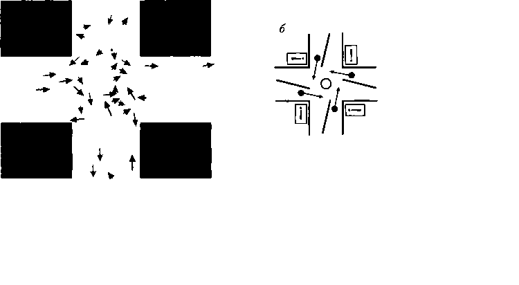 Значительно сложнее выглядят картины самоорганизации движения на перекрестках. Моделирование показало, что в этом случае вообще не существует стабильного состояния, позволяющего минимизировать число виртуальных столкновений и «уличных заторов», однако часто возникают некоторые временные режимы движения, при которых потоки пиплоидов двигаются по круіу в том или ином направлении (рис. 6.7, а), и этот результат, возможно, стоило бы использовать на практике при планировании пешеходных маршрутов. Например, установка столба в центре перекрестка исключает маршруты, препятствующие круговому движению, а установленные под углом к направлению потоков барьеры стабилизируют круговое движение, особенно при дополнительном применении указателей и т.п. (рис. 6.7, б).