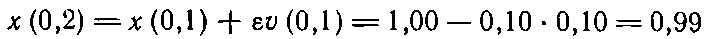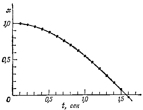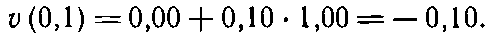 Давайте теперь действительно решим нашу задачу. Допустим, что мы взяли ?=0,100 сек. (Если после того, как мы проделаем все вычисления, окажется, что этот интервал не достаточно мал, то необходимо повторить все сначала с меньшим интервалом времени, например 0,010 сек.) Чему будет равно х(0,1), если в начальный момент времени x(0)=1? Оно равно старому положению x(0) плюс скорость в начальный момент (которая равна нулю), умноженная на 0,10 сек. Таким образом, x(0,1) равно 1,00, ибо грузик еще не начал двигаться. Но новая скорость в момент 0,10 сек будет равна старой скорости v(0)=0 плюс ?, умноженное на ускорение. А само ускорение равно -x(0)=-1,00. Так что