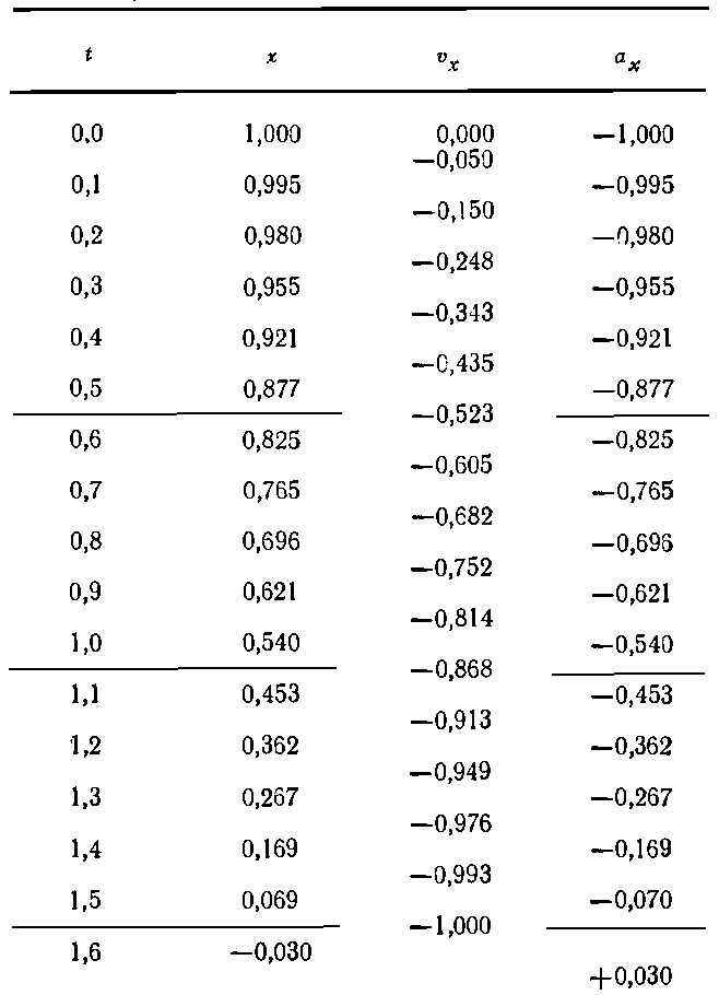 Ну, а теперь все готово для расчетов. Для удобства можно их выполнить в виде таблицы, в столбцах которой стоят время, положение, скорость и ускорение, причем скорость пишется в промежутках между строками (табл. 9.1). Такая таблица есть, конечно, просто удобный способ записи результатов, полученных из уравнений (9.16), и фактически полностью заменяет их. Мы просто заполняем одно за другим свободные места в ней и получаем очень интересную картину движения: сначала грузик находится в покое, затем понемногу приобретает отрицательную скорость (вверх), а это приводит к уменьшению его расстояния от точки равновесия. При этом хотя ускорение и становится меньше, оно все еще «подгоняет» скорость. Однако по мере приближения к положению равновесия (x=0) ускорение становится все меньше и меньше, скорость нарастает все медленней и медленней, но все же еще нарастает вплоть до точки x=0, которая достигается примерно через 1,5 сек. Скажем по секрету, что произойдет дальше. Грузик, конечно, не остановится в точке x=0, а пойдет дальше, но теперь все пойдет наоборот: его положение х станет отрицательным, а ускорение — положительным. Скорость начнет уменьшаться. Интересно сравнить полученные нами числа с функцией cost. Результат этого сравнения представлен на фиг. 9.4.