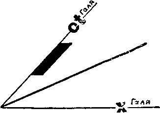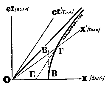 Валя свой метр (отрезок ОB, отсеченный на ее оси расстояний калибровочной линией длины) проецирует на Галину ось расстояний. Выходит отрезок ОВ1. Он заметно меньше отрезка ОГ, изображающего метр Гали в ее системе отсчета.