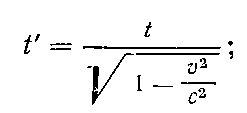 Здесь t’ — релятивистская длительность, t — собственная длительность, l’ — релятивистская длина, l — собственная длина, с — скорость света, v — относительная скорость систем отсчета.