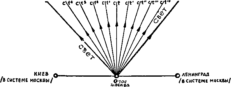 Следующее усложнение. К будущему присоединяем прошлое. Ленинградские поезда в полночь проезжают Москву и едут дальше, в Киев. Киевские, минуя в полночь же Москву, следуют в Ленинград. Телеграммы из Киева в Ленинград и из Ленинграда в Киев точно в 0 часов проскакивают через Москву: