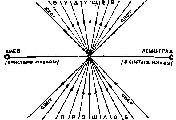 Световые линии скрестились. Сверху между ними будущее, снизу—прошлое. А справа и слева — те области мира, куда поезда, подчиняющиеся нашему невообразимому расписанию (все минуют Москву в полночь и от этой мировой точки считают свои времена и расстояния), попасть не могут. Ибо нет в природе поездов, несущихся быстрее света.