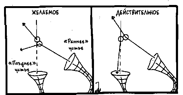 Представьте себе, что вы пытаетесь проделать вышеописанный фокус. В результате получится вот что (с вашей точки зрения); вы наносите удар, но до того, как ваш шар попадает в первое («позднее») устье кротовой норы, в точности такой же шар вылетает из второго («раннего») устья и слегка ударяет по вашему шару. Ваш мяч все равно попадет в кротовую нору, но под несколько иным углом, чем вы собирались. Не забывайте, что вы рассчитывали удар с единственной целью сбить с траектории собственный шар, и ничего у вас не вышло. Вообще-то с учетом того угла, под которым ваш шар вошел в кротовую нору, вы бы ожидали, что шар из второго устья («раннего») вылетит именно под тем углом, под которым он вылетел. Так и случилось.