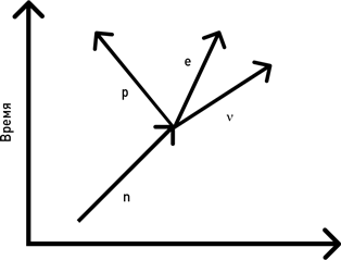 Ферми представил распад нейтрона аналогичным образом, но вместо нейтрона, испускающего фотон и остающегося при этом собой, то есть всё тем же нейтроном, нейтрон n у него испускал пару частиц – электрон e и нейтрино n – и превращался в протон p.