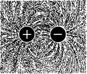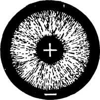 Обнаружить существование электрического поля возле заряда можно весьма простым опытом. Для этого надо наклеить на стеклянную пластинку кружочек из станиоля или фольги, наэлектризовать его и посыпать мелкими игольчатыми кристалликами гипса или хинина. Кристаллики разложатся по линиям расходящимися лучами во все стороны от заряженного кружка. Если вырезать из фольги два кружка и им сообщить электрические заряды — одному положительный, а другому отрицательный, затем на стекло насыпать мелкие игольчатые кристаллики гипса, то под воздействием электрического поля иголочки гипса улягутся в определенном порядке; их расположение отчасти напоминает размещение железных опилок возле полюсов магнита (рис. 8).