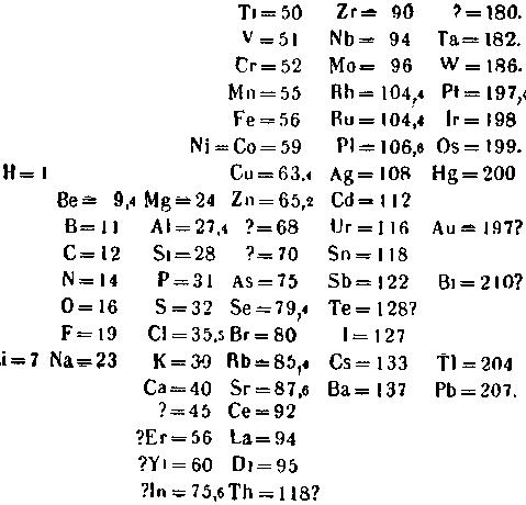 На рисунке 1 приведена периодическая система элементов в том виде, как она была впервые опубликована Д. И. Менделеевым. Вторым по порядку в этой таблице стоит элемент литий (Li). Это — лёгкий, так называемый щелочной металл; соединяясь с водой, он образует щёлочь. За ним следуют шесть элементов, свойства которых иные, чем у лития. Но седьмой элемент, натрий (Na), снова повторяет свойства лития; это — тоже щелочной металл. Ещё через шесть элементов, через период элементов, мы видим новый щелочной металл — калий (К).