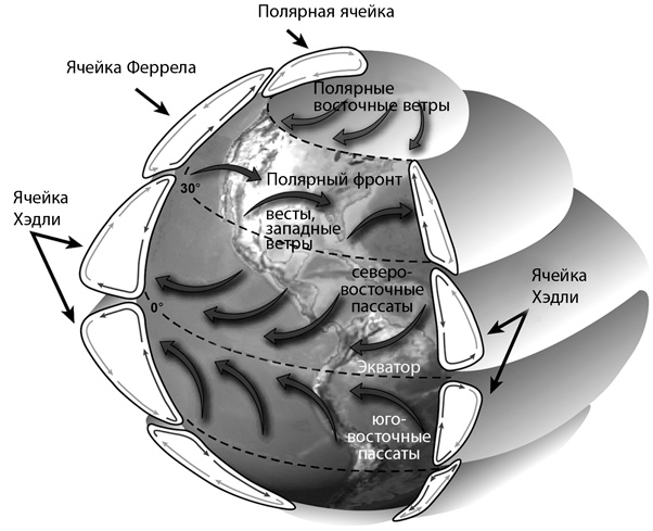Наконец, холодный воздух на полюсах, который движется по направлению к экватору, попадает в ветры, дующие гораздо быстрее в восточном направлении, и этот воздушный поток отклоняется на запад по отношению к этим ветрам. Эти воздушные течения называются полярными восточными ветрами, которые преобладают примерно на 60?м градусе широты в обоих полушариях (например, на Аляске или в Антарктиде). В Северном и Южном полушариях Земли есть три вращающиеся в противоположных направлениях циркуляционные ячейки, которые охватывают Землю параллельно экватору. Они ответственны за перенос горячего воздуха от экватора к полюсам и прохладного воздуха от полюсов к экватору. В этом процессе они управляют преимущественными ветрами планеты, которые находятся, по сути, в нижней части каждой из этих ячеек. Эти преимущественные ветра в основном определяют метеорологические условия (а также высотные струйные течения, которые находятся в верхней части циркуляционных ячеек, а также между ними). Во времена плаваний под парусами они были чрезвычайно важны для моряков.