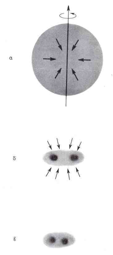 Рис. 13.2. Вращающееся облако межзвездного газа начинает сжиматься под действием гравитационных сил. Направление вращения показано на верхнем рисунке. Вначале газ равномерно движется по всем направлениям к центру. Затем образуется вращающийся диск (рисунок посередине), на который газ поступает из полярных областей (направление движения газа показано черными стрелками). Образуется кольцо уплотнения, которое на нижнем рисунке показано в сечении двумя кружками. На рис. 13.3 это же кольцо показано в плане. В этом процессе, рассчитанном Боденгеймером и Чарнутером в 1978 г., не образуется центральной звезды.