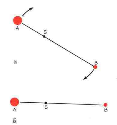 А как обстоит дело с массами других звезд? С двойными звездами, которые можно разделить с помощью телескопа (иначе говоря, которые наблюдаются в телескоп как звездная пара), можно поступить точно так же. Разница только в том, что здесь два тела обращаются относительно друг друга и массы их различаются не так сильно, как массы Земли и Солнца. Существенным становится то, чем мы пренебрегли в предыдущем случае: здесь не одно тело обращается вокруг другого, а каждое из них обращается вокруг их общего центра масс. Итак, для двух звезд — обозначим их А и В в двойной системе справедливо соотношение