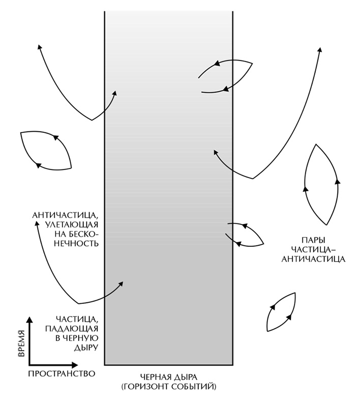 Как же черная дыра умудряется испускать частицы, когда известно, что ничто не может уйти из-под ее горизонта событий? Квантовая механика отвечает на этот вопрос так: частицы появляются не из «нутра» черной дыры, а из «пустого» пространства сразу за горизонтом событий. Это следует понимать следующим образом: пространство, которое мы считаем «пустым», не может быть таковым в действительности, потому что это означало бы, что все поля, включая электромагнитное и гравитационное, должны быть равны нулю. Но величина поля и скорость его изменения со временем сходны с положением и скоростью частицы: согласно принципу неопределенности чем точнее одна из этих величин, тем с меньшей точностью мы можем рассчитать другую. Так, в «пустом» пространстве поле не может быть в точности равно нулю, поскольку в этом случае оно имело бы точное значение (нулевое) и точную скорость изменения (тоже нулевую). Величина поля должна содержать некоторую минимальную неопределенность, или квантовые флуктуации. Эти флуктуации можно рассматривать как пары частиц света или гравитации, которые совместно рождаются в некоторое время, расходятся, а затем снова сходятся и взаимно аннигилируют. Это виртуальные частицы, аналогичные тем, что переносят гравитационную силу Солнца: в отличие от реальных частиц, их невозможно обнаружить непосредственно – с помощью детектора частиц. Но их косвенные проявления – например, небольшие изменения энергии орбит электронов в атомах – поддаются измерению и замечательно согласуются с теоретическими предсказаниями. Из принципа неопределенности также следует возникновение сходных виртуальных пар частиц вещества, таких как электроны и кварки. Но в этом случае один из членов пары должен быть частицей, а второй – античастицей (античастицы света и гравитации совпадают с соответствующими частицами).
