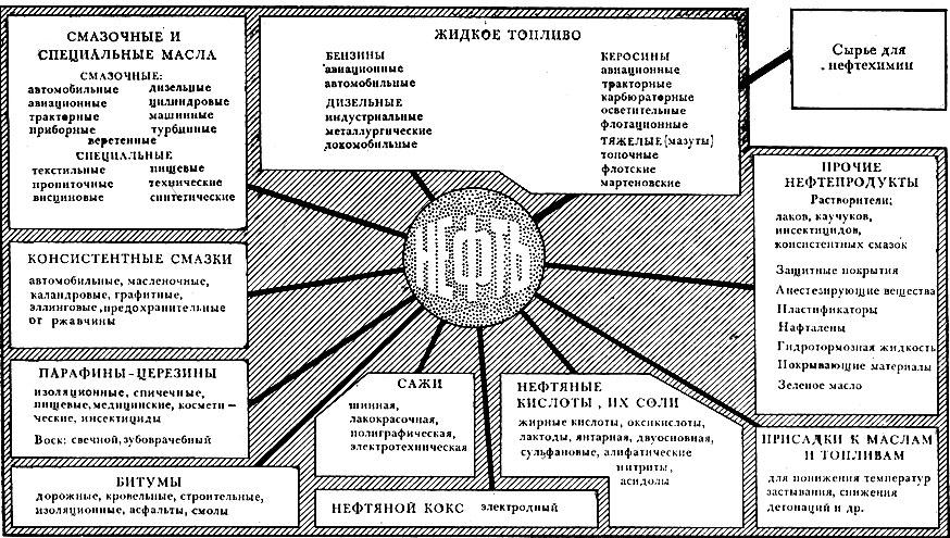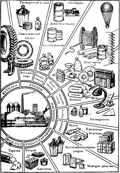 В послевоенное время потребность в нефти и углеводородных газах существенно увеличилась в связи с тем, что они стали сырьем для целой отрасли промышленности - нефтехимической, без которой в настоящее время немыслим технический прогресс. Синтетические каучуки, спирты, строительные материалы, моющие средства, гербициды, инсектициды и многие другие вещества и материалы, применяющиеся во всех отраслях народного хозяйства и в быту, производятся из нефти и природного газа (рис. 3-5).