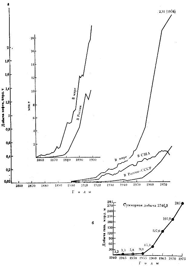 Всего же из недр нашей страны извлечено 8,7 млрд. т нефти и 3,85 трлн. м3 газа. Количество добытого газа больше, так как извлекавшийся вместе с нефтью попутный газ долгое время не использовался и не учитывался.