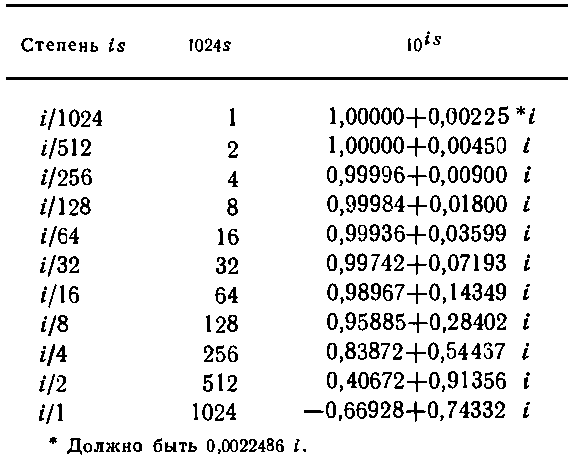 Теперь можно составить таблицу, которая позволит вычислить все мнимые степени 10, т. е. найти числа x и y. Надо поступить так. Начнем с показателя 1/1024, который мы считаем равным примерно 1+2,3025 i/1024. Тогда