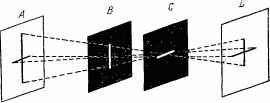 Иначе изобразится на стекле горизонтальная линия при том же расположении щелей. Через первую (горизонтальную) щель лучи пройдут беспрепятственно, не перекрещиваясь, пока не достигнут вертикальной щели В; через эту щель лучи пройдут как через дырочку и дадут на матовом стекле A изображение в том масштабе, который отвечает расстоянию A от второй перегородки В.