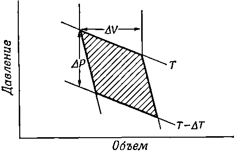 Фиг. 45.1. Диаграмма Р — V для цикла Карно. Кривые, помеченные Т и Т—?Т,— изотермы; крутые кривые между ними — адиабаты. Когда газ изотермически расширяется при температуре Т, он получает тепло ?Q и увеличивает свой объем на ?V; ?Р—изменение давления при постоянном объеме, температура в это время падает с Т до Т—?T.