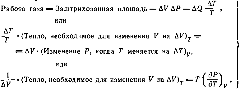 А теперь вычислим эту площадь чисто геометрически. Цикл, который был использован для получения фиг. 45.1, отличается от цикла, описанного в предыдущей главе тем, что теперь ?Q и ?T бесконечно малы. Наши адиабаты и изотермы очень близки друг к другу, поэтому фигура, описанная жирными линиями на фиг. 45.1, приближается к параллелограмму, когда приращения ?Q и ?Т стремятся к нулю. Площадь этого параллелограмма в точности равна ?V?P (где ?V — изменение объема, когда к газу подводится энергия ?Q при постоянной температуре, а ?Р — изменение давления при изменении температуры на ?T и постоянном объеме). Легко показать, что заштрихованная площадь на фиг. 45.1 равна площади, ограниченной пунктиром на фиг. 45.2.