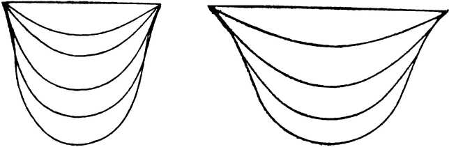 Произведем теперь другой опыт, такой же простой, как и предыдущий. Вот у меня трубка, из которой медленно, не сплошной струей, а по капелькам, вытекает вода; каждая капля медленно нарастает, пока не достигнет известной предельной величины и не оторвется сразу. Обращаю ваше внимание на то, что всякий раз, когда капля отрывается, она имеет одну и ту же величину и одну и ту же форму. Это не может быть делом простой случайности; должна существовать какая-нибудь причина, обусловливающая предельный размер и форму капли. Почему вообще вода держится на кончике трубки? Ведь вода обладает тяжестью и стремится упасть, однако, не падает сразу; она прилипает к кончику трубки и держится на нем, пока количество ее не достигнет определенной величины, а тогда капля сразу отрывается, как будто то, что держало воду, оказалось недостаточно крепким. Один ученый тщательно вычертил в увеличенном масштабе точные формы капли при различной ее величине, и этот рисунок перед вашими глазами (рис. 2, слева).