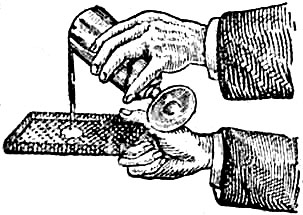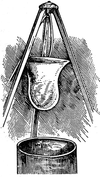 На поверхности чистой, прозрачной воды имеется особый упругий слой, подобный упругой перепонке. Вот у меня маленькое ситечко, сделанное из проволочной сетки, достаточно крупной, чтобы через ее отверстия могла проходить обыкновенная булавка. Между прочим, заметим, что в дне ситечка имеется около одиннадцати тысяч таких отверстий. Далее, как вам известно, чистая проволока смачивается водой, т. е., вынутая из воды, она оказывается мокрой; но бывают вещества, как, например, парафин, которые не смачиваются водой: вода не прилипает к парафину, в чем вы можете убедиться сами, погрузив парафиновую свечу в воду. В расплавленный на сковородке парафин я и опустил эту сетку, чтобы вся она покрылась тонким слоем парафина; но, чтобы парафин не залепил отверстий, я хорошенько встряхну ее, пока парафин еще не застыл. Вы видите на экране, что все отверстия, за исключением одного-двух, остались открытыми и что обыкновенная булавка свободно проходит сквозь них. Наш прибор готов. Итак, если поверхность воды обладает подобием упругой перепонки, для разрыва которой необходима сила, воде будет не так-то легко вытечь через эти отверстия, она вообще не будет протекать через них, пока ее не заставят, потому что, чтобы пройти на другую сторону, воде нужно разорвать свою упругую оболочку в каждом отверстии. Вы понимаете, что это рассуждение правильно только в том случае, если вода не может придти в тесное соприкосновение с проволокой, т. е. не смачивает ее. Я стану наливать теперь в ситечко воду, и, чтобы помешать ей ударяться о дно с большой силой, что заставило бы ее пройти насквозь, я кладу на дно маленький кусочек бумаги и лью воду на бумагу, которая и разбивает струю (рис. 5).