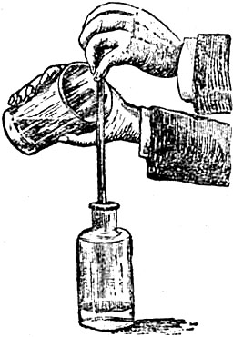 Я хочу привести еще один пример, подтверждающий существование такой упругой перепонки на поверхности воды. Попробуйте налить воду из стакана в узкогорлую бутылку. Вы знаете, что если вы будете наливать медленно, то почти вся вода станет стекать по стенке стакана и будет литься мимо бутылки; если же вы станете лить быстро, то в узком горлышке бутылки не хватит места сразу для большого количества воды, и она опять-таки прольется мимо. Но если вы возьмете какой-нибудь прутик или стеклянную палочку, и прислоните ее к краю стакана, то вода будет отекать по палочке в бутылку и ничего не прольется (рис. 6); вы можете даже держать палочку наклонно, как это я делаю сейчас, и вода все же будет течь по палочке, потому что упругая перепонка внешнего слоя образует своего рода трубку, которая не дает воде проливаться.