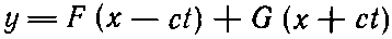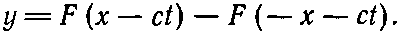 будет общим решением для любой струны. Но нам, помимо этого, нужно еще удовлетворить условию неподвижности одного конца. Если в уравнении (49.1) мы положим х=0 и посмотрим, какие будут у в любой момент t, то получим y=F(-ct)+G(+ct). Но эта сумма должна быть нулем в любой момент времени, а это означает, что функция G(+ct) должна быть равна -F(-ct). Другими словами, функция G от некоторой величины должна быть равна функции -F от той же величины со знаком минус. Подставляя снова полученный результат в уравнение (49.1), находим решение поставленной задачи: