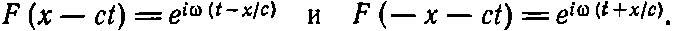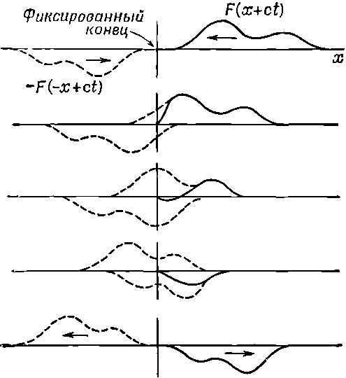 Первый пример волн в ограниченном пространстве — это волны в пространстве, ограниченном с одной стороны. Давайте возьмем простой случай одномерной волны на струне. Можно было бы рассмотреть плоскую звуковую волну в пространстве, ограниченном с одной стороны стенкой, или какие-то другие примеры той же природы, но для наших теперешних целей вполне достаточно простой струны. Предположим, что один конец струны закреплен, ну, например, вмурован в «абсолютно жесткую» стенку. Математически это можно описать, указав, что перемещение струны у в точке x=0 должно быть нулем, ибо конец струны не может двигаться. Далее, если бы в этом деле не участвовала стенка, то, как мы знаем, общее решение, описывающее движение струны, можно было бы представить в виде суммы двух функций F(x-ct) и G(x+ct), причем первая описывает волну, бегущую по струне в одну сторону, а вторая — в другую, так что