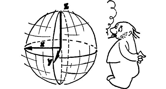 «Привяжем» Декартову координатную систему к Земле. Начало координат — центр Земли. Ось z направлена от центра к Северному полюсу. Ось x — от центра к точке пересечения Гринвичского меридиана с экватором (0° широты и 0° долготы). Ось y — от центра к точке 0° широты и 90° восточной долготы.