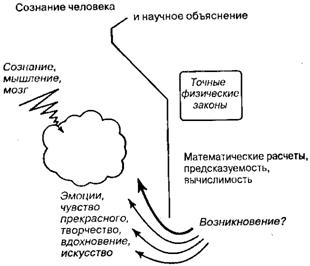 На рис. 3.4 я попытался выделить и обобщить некоторые характеристики этих двух миров. С правой стороны отмечено, что физический мир воспринимается нами как нечто подчиняющееся точным математическим и физическим законам (я об этом довольно много говорил в первых двух главах книги). Слева мы имеем сознание, принадлежащее мысленному миру, и связанные с ним понятия типа «душа», «настроение», «религиозность» и т.п., часто употребляемые бессистемно. В наши дни люди предпочитают давать всему научные объяснения и, более того, полагают, что любое научное описание можно в принципе каким-то образом внести в компьютер (т. е. считают, что если математическое описание чего-то существует, то оно может быть записано в память ЭВМ). Опровержению именно этого утверждения и посвящена в основном данная глава (при этом я по-прежнему остаюсь сторонником так называемого физикализма).