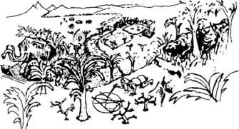 Первая из них (рис. 3.7) относится к связи понимания с естественным отбором. Любой первобытный математик с точки зрения естественного отбора и дарвиновской межвидовой борьбы за существование находится в весьма невыгодном положении (по сравнению, например, с показанным на рисунке саблезубым тигром). Однако на заднем фоне картинки можно видеть сородичей математика, которые успешно охотятся на мамонтов, строят дома, выращивают какие-то злаки и т. п. Все эти операции требуют от первобытных людей развития «понимания», но заметьте, что сам математик в этих действиях непосредственно не участвует. Таким образом, качество и уровень «понимания» могут существенно влиять на процессы естественного отбора видов, хотя сами математические алгоритмы не имеют к этим процессам никакого прямого отношения.