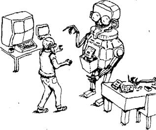 На другой карикатуре (рис. 3.8), связанной с одним из сюжетов книги «Тени разума», показан созданный по некоторому проекту робот с искусственным интеллектом. Сюжет относится к дискуссии между роботом и специалистом по АI, которая достаточно сложна и занимает в книге много места, вследствие чего я не буду ее пересказывать. В свое время моя точка зрения на доводы Гёделя-Тьюринга была подвергнута жестокой критике самыми различными людьми, с самых разных позиций и по самым разным причинам. Дискуссия в книге «Тени разума» между AI-экспертом и роботом представляет собой мою попытку обобщения всех новых доводов и возражений.