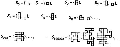В такой модели рассматриваются лишь дискретные моменты времени (мы можем обозначить их просто 0, 1, 2, 3, 4, ...), каждому из которых соответствует некоторое состояние Вселенной, описываемое некоторым набором так называемых полиомино. Вы, естественно, вправе спросить меня, что означает этот новый термин? Полиомино представляет собой просто некий набор квадратиков, способных заполнять плоскость, объединяясь друг с другом (рис. 3.10). Меня сейчас интересуют наборы таких полиомино. Состояние вселенной в предлагаемой игрушечной модели задается только двумя реальными и конечными наборами полиомино. На рис. 3.10 приведены все возможные конечные множества полиомино, перечисленные в соответствии с некоторой вычислительной процедурой S0, S1, S2, ... Как выглядит динамика или эволюция этой забавной игрушечной вселенной? Ее развитие начинается в некоторый начальный момент времени с набора полиомино (S0, S0), а затем продолжается в виде все новых пар множеств полиомино, отбираемых по некоторому заданному правилу. В соответствии с правилом отбора учитываются только такие наборы плиток полиомино, которые позволяют заполнить плоскость целиком. Отбор, следовательно, сводится лишь к решению следующей задачи: можно ли заполнить плоскость плитками заданного набора таким образом, чтобы на плоскости не было «зазоров» или «накладок»? Предположим далее, что в некоторый момент времени наша игрушечная вселенная свелась к двум конкретным наборам полиомино (Sq, Sr), определяющим всю дальнейшую эволюцию данной модели. Если вы можете покрыть всю плоскость набором полиомино Sq, то вы переходите к следующему полиомино (Sq+1, т.е. получаете для следующего момента времени пару множеств (Sq+1, Sr). Если же вам это не удается, вы должны поменять наборы местами, что дает вам новую пару (Sr, Sq+1). Чем нам может быть интересна эта очень простая и даже несколько примитивная модель? Суть рассматриваемой модели в том, что хотя ее эволюция носит совершенно детерминистический характер (ведь выше я задал абсолютно ясную и полностью определенную процедуру развития), она не является вычислимой. Дело в том, что Робертом Бергером была доказана теорема, в соответствии с которой не существуют компьютерные операции, позволяющие моделировать развитие этой вселенной, поскольку можно строго показать, что не существуют алгоритмы, позволяющие решить задачу о заполнении плоскости набором полиомино.